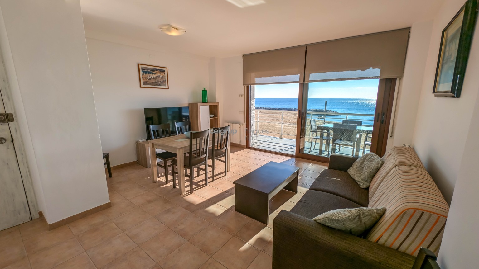 The spacious and bright living-dining room includes a comfortable sofa and provides access to a large terrace with panoramic views of the entire bay, from Palamós to Torre Valentina. The terrace is equipped with outdoor furniture, including a table and chairs for dining al fresco, as well as a sunbed for relaxing while enjoying the surroundings. Additionally, the terrace has a solar awning for sun protection.